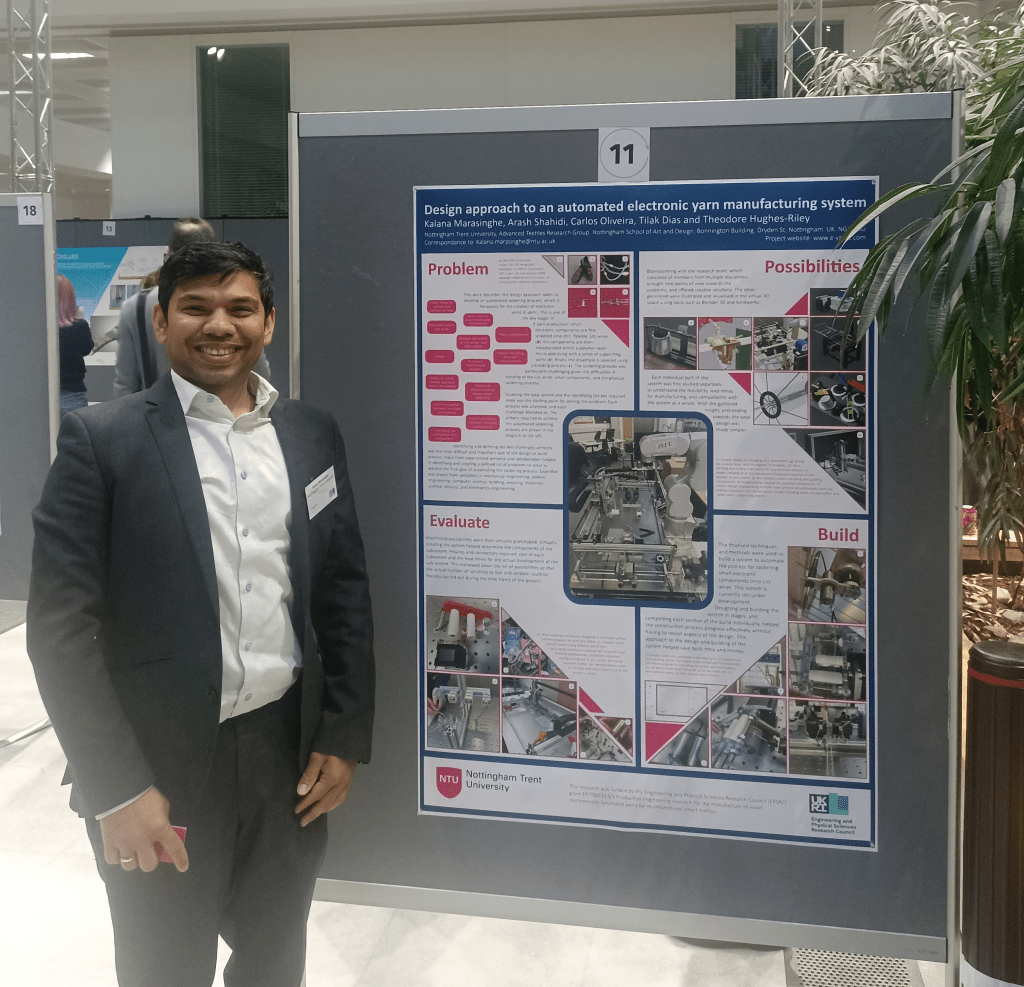 Last week members of the ATRG team attended the Future Textiles 2023 conference in Bristol (UK), which covered a range of textile related topics including electronic textiles, technical textiles, and sustainable textile manufacturing. Kalana Marasinghe (pictured above) presented a poster on the ‘Design approach to an automated electronic yarn manufacturing system‘, which is directly linked to his work designing and engineering the new automated soldering system for the ‘Production engineering research for the manufacture of novel electronically functional yarns for multifunctional smart textiles‘ project. Theo Hughes-Riley (pictured below) gave an invited talk on ‘Recent advances in the automated production of electronic yarns‘ which gave a more holistic overview of the recent developments on the project.