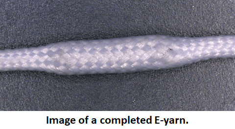 Finally the ensemble is covered in a braided structure that is created using a suture braiding machine. This consolidates the structure and gives the E-yarn a normal textile appearance.