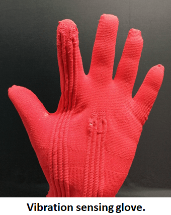 A knitted glove that is capable of measuring vibration at two points on the hand (index finger and palm) has been developed for the monitoring of hand transmitted vibrations. Hand transmitted vibrations can lead to serious musculoskeletal, neurological, and vascular disorders; therefore, monitoring vibration exposure can prevent overexposure to vibrations and therefore injury. The current glove prototype includes four vibration sensing E-yarns.