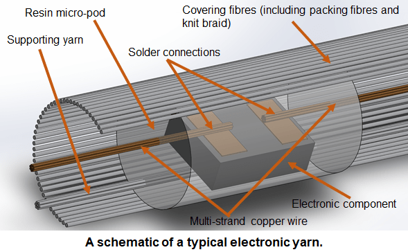 Electronic yarns are an innovative method of integrating electronics within textiles by incorporating the electronic functionality within the heart of yarns, which can then be used to create textiles. To create an E-yarn a semi-conductor or Microelectromechanical Systems (MEMS) device must first be soldered onto fine copper wires. These copper wires are multi-filament and behave similarly to a normal textile fibre. The copper wires create the electrical interconnections needed to power and communicate with the device. The device and solder joints are then paired with a high-strength textile yarn (such as Vectran™) and encapsulated within a small resin cylinder, or micro-pod. The micro-pod protects the device and solder joints from mechanical and chemical stresses, while the high-strength textile yarn supports the copper wire and ensures that it will survive commercial knitting or weaving processes. Finally the copper wires and the micro-pod are covered in packing fibres and a textile sheath that is either created with a knit-braiding machine, or braiding machine. This gives the final E-yarn the look and feel of a conventional textile and further improves its mechanical durability.